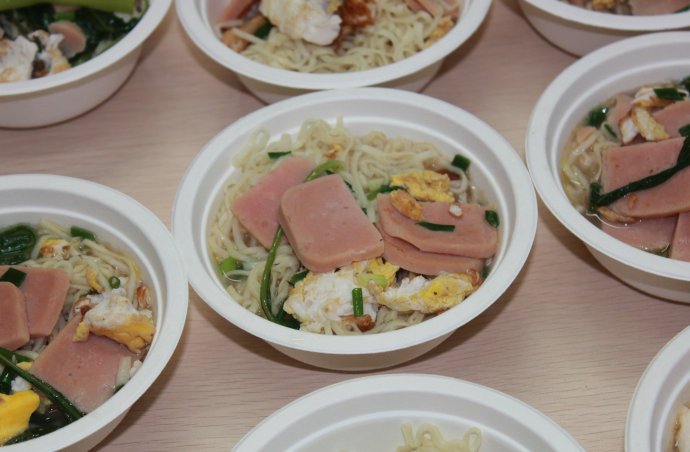 長壽面。手巧的同事們幫忙做的,有加料哦,相當?shù)孛牢赌?br />