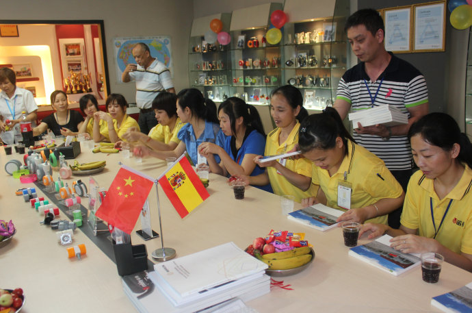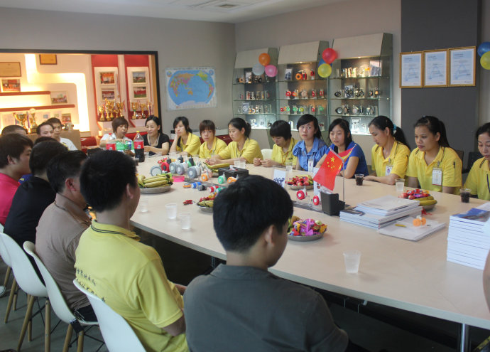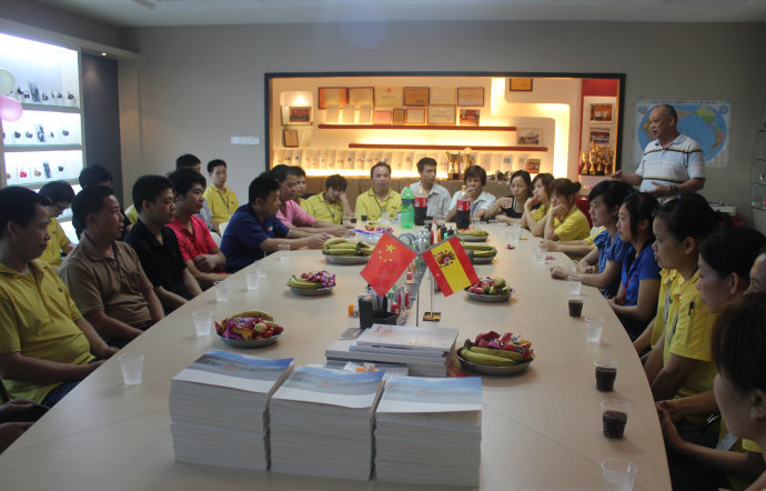 主角出場,各部門同事齊聚公司展廳,兩邊都是公司的產品樣板,在這個氛圍中,更是讓大家感覺到,諾貝人,你們真棒!