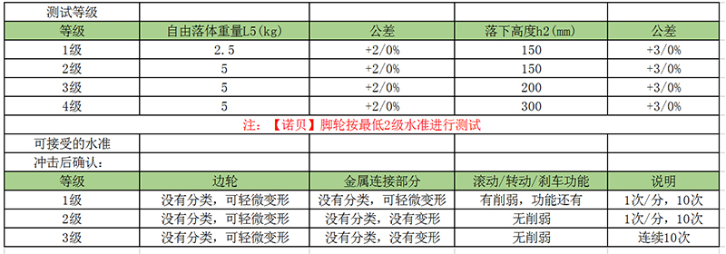 把腳輪產品固定在設備上,然后在制手施加一個作用力 L3 ( 諾貝技術部制定或者按客戶要求) 用每分鐘10次的速度,測試5000次后檢測有沒有破損,剎車功能是否還在.